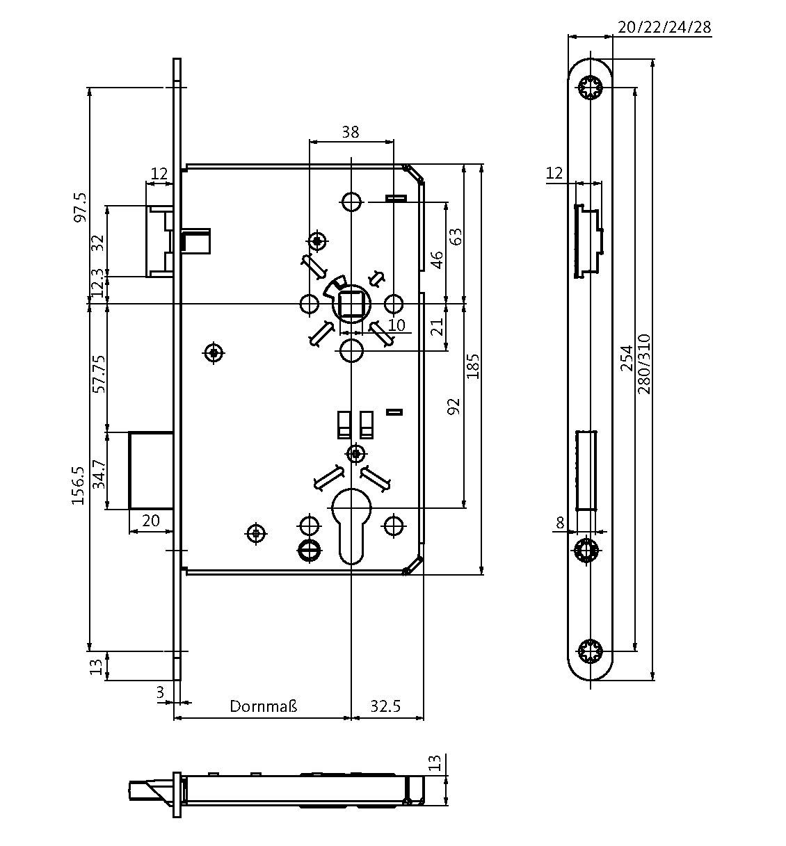 Produktinformationen "Haustürschloss, D 65mm, Stulp 20mm, DIN Rechts"